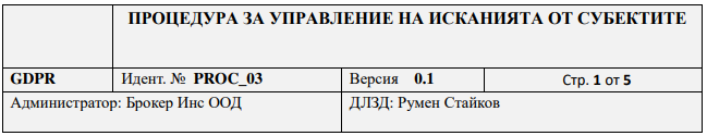 Всички лични данни, обработвани от Брокер Инс ООД, попадат в обхвата на тази процедура. С този документ Брокер Инс изпълнява задължението си на администратор на лични данни да указва съдействие и да осигурява упражняването на правата на субектите на лични данни. Субектът на данни може в защита на своите права да отправи към Администратора следните искания: